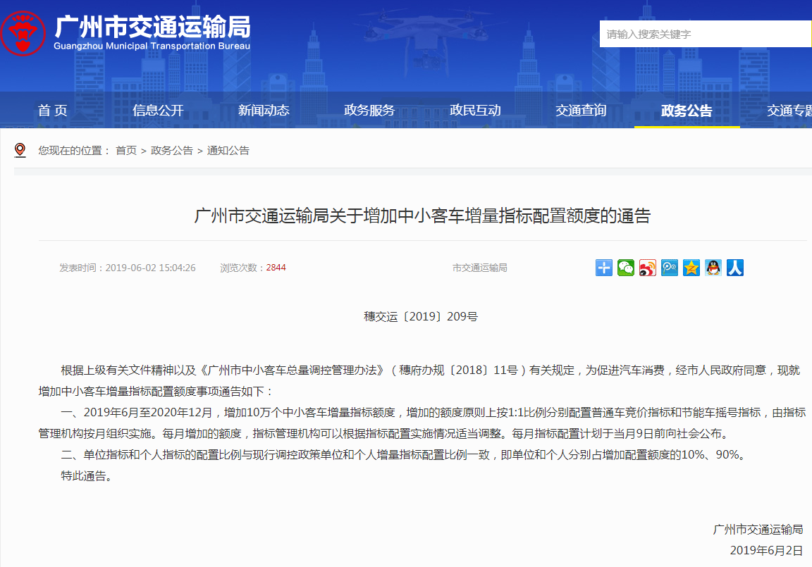 广州市交通运输局发布《关于增加中小客车增量指标配置额度的通告》,明确在原有额度的基础上,本月起至2020年12月,增加10万个中小客车增量指标,增加的额度原则上按1:1比例分别配置普通车竞价指标和节能车摇号指标,由指标管理机构按月组织实施,单位和个人分别占增加配置额度的10%、90%。