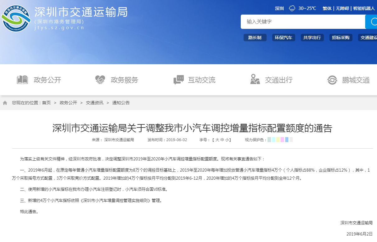 深圳市交通运输局发布《关于调整小汽车调控增量指标配置额度的通告》,规定从2019年6月起,小汽车增量指标增加4万个,2020年全年,增加4万个。其中个人指标占比88%,企业指标12%。每年新增的4万个指标中,1万个采取摇号的方式配置,3万个采取竞价的方式。同时还强调新增的小汽车指标须符合国VI标准。