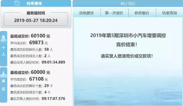 2019年5月27日,第5期深圳市小汽车增量指标竞价结果出炉,个人车牌和单位车牌成交均价都接近7万元。
