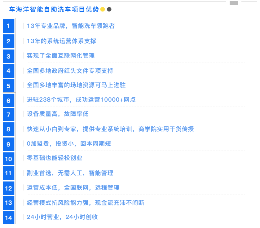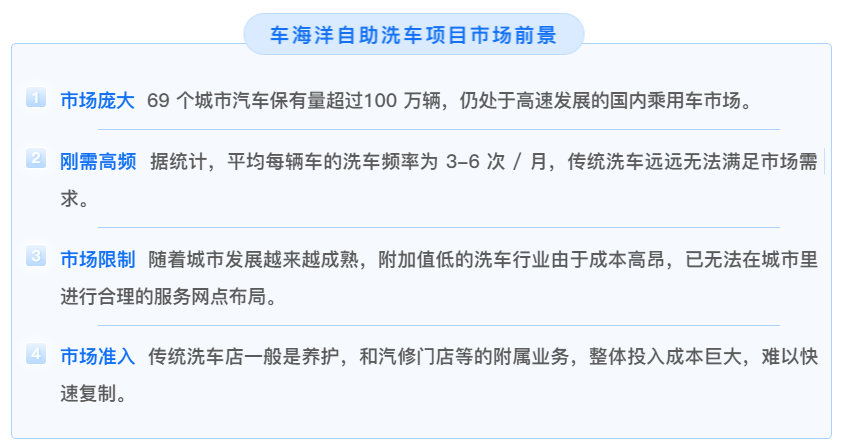 从2014年推出车海洋智能自助洗车项目以来,智能自助洗车项目便得到广大车主朋友的青睐,车海洋智能洗车网点遍布全国238个城市,迄今已建设超10000个网点,服务2000多万名会员。