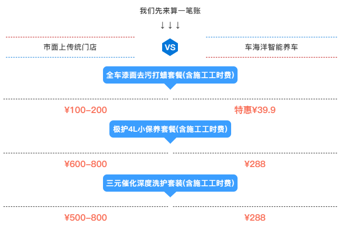 相比于传统门店的保养业务,相同的保养套餐,车海洋智能养车在价格上有很大的优势,替车主省下不少养车费,让养车不再难!