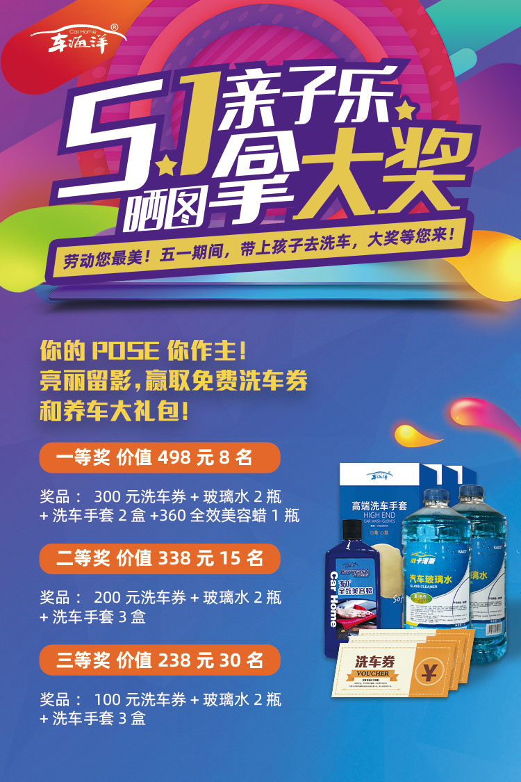 五一假期,带上家人来车海洋洗车吧!车海洋全国站点在五一期间,举办“5.1亲子乐 晒图拿大奖”回馈活动,拍下亲情,拍下幸福,拍出创意,拍出温馨,把大奖拿回家!