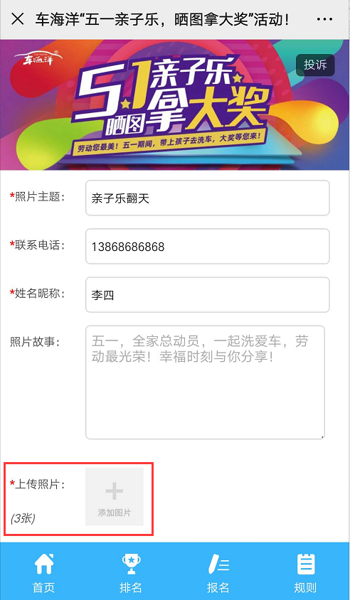3、①点击“报名”,填写个人信息,并上传3张洗车照片,参与活动。