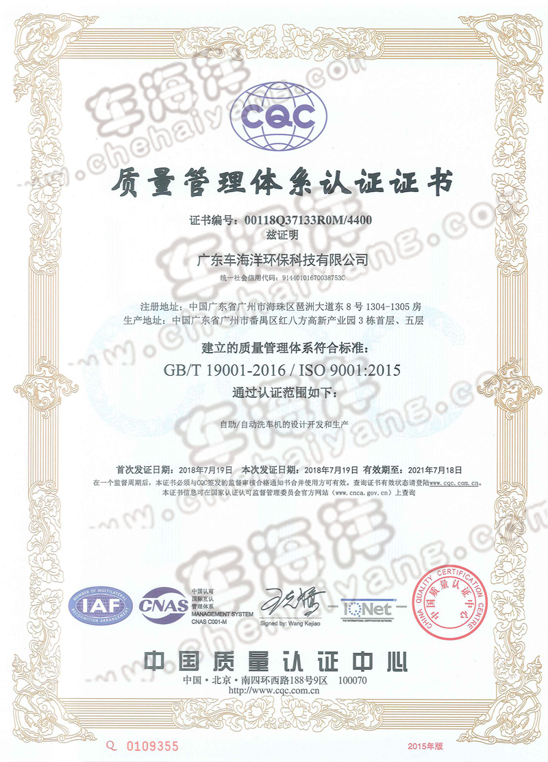 2018年7月19日,广东车海洋环保科技有限公司正式通过了ISO9000质量管理体系认证,荣获中国质量认证中心(CQC)颁发的质量管理体系认证证书,这标志着车海洋运营管理服务在专业化、标准化方面处在行业领先水平。