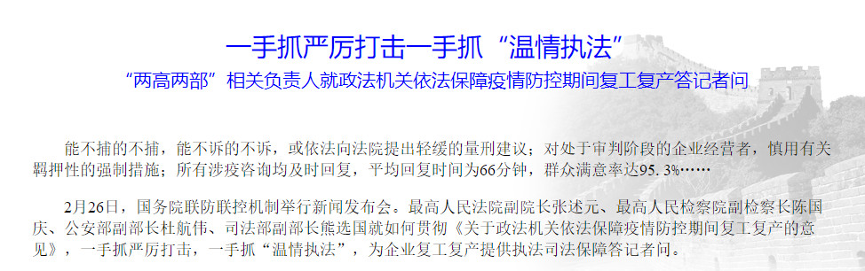 2月26日,国务院联防联控机制举行新闻发布会上,公安部副部长杜航伟表示:“公安部将指导各地公安机关,在保障疫情防控和复工复产当中,多一些柔性执法,多一些说理执法和人文关怀,尽量化解掉旧矛盾,不产生新矛盾。对主观恶意小、危害不大、依法可处罚可不处罚的,要坚持以教育为主······”