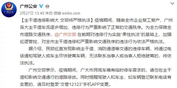 近日,广州公安部门发布:在疫情期间广州交警前期对违停行为实施“柔性执法”,但对于在主干道违停和严重影响交通秩序的违法行为严格执法。