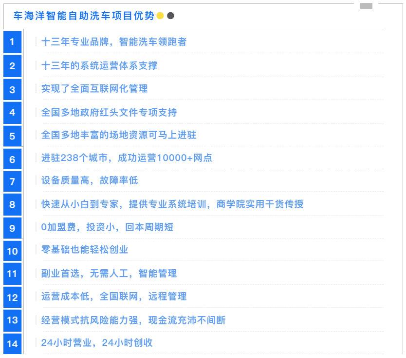 国家支持开展城市公共服务设施建设, 抓住这个风口,开设一个智能自助洗车网点,你值得拥有!没有高昂的房租和人工成本,不怕股市波动,不怕被割韭菜,自己当老板,实现创富梦!有稳健的现金流收入,无需人工值守,24小时产生收益,这样的投资难道不香吗?