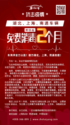 自疫情爆发后,为了支援抗“疫”战,车海洋快速反应,在全国范围内发起“低价洗车、免费消毒”的公益行动,号召全国一万个网点都行动起来,免费为汽车消毒,切断病毒传染链条,保障车主健康出行。从2月7日开始,陆续在湖北、上海、江苏、山东、广东、广西、湖南、福建、吉林、江西、浙江、云南等多个地区推出车辆免费消毒活动。目前,车海洋专业的免费消毒服务已经覆盖全国20多省区,数千个网点实现了线下免费消毒。