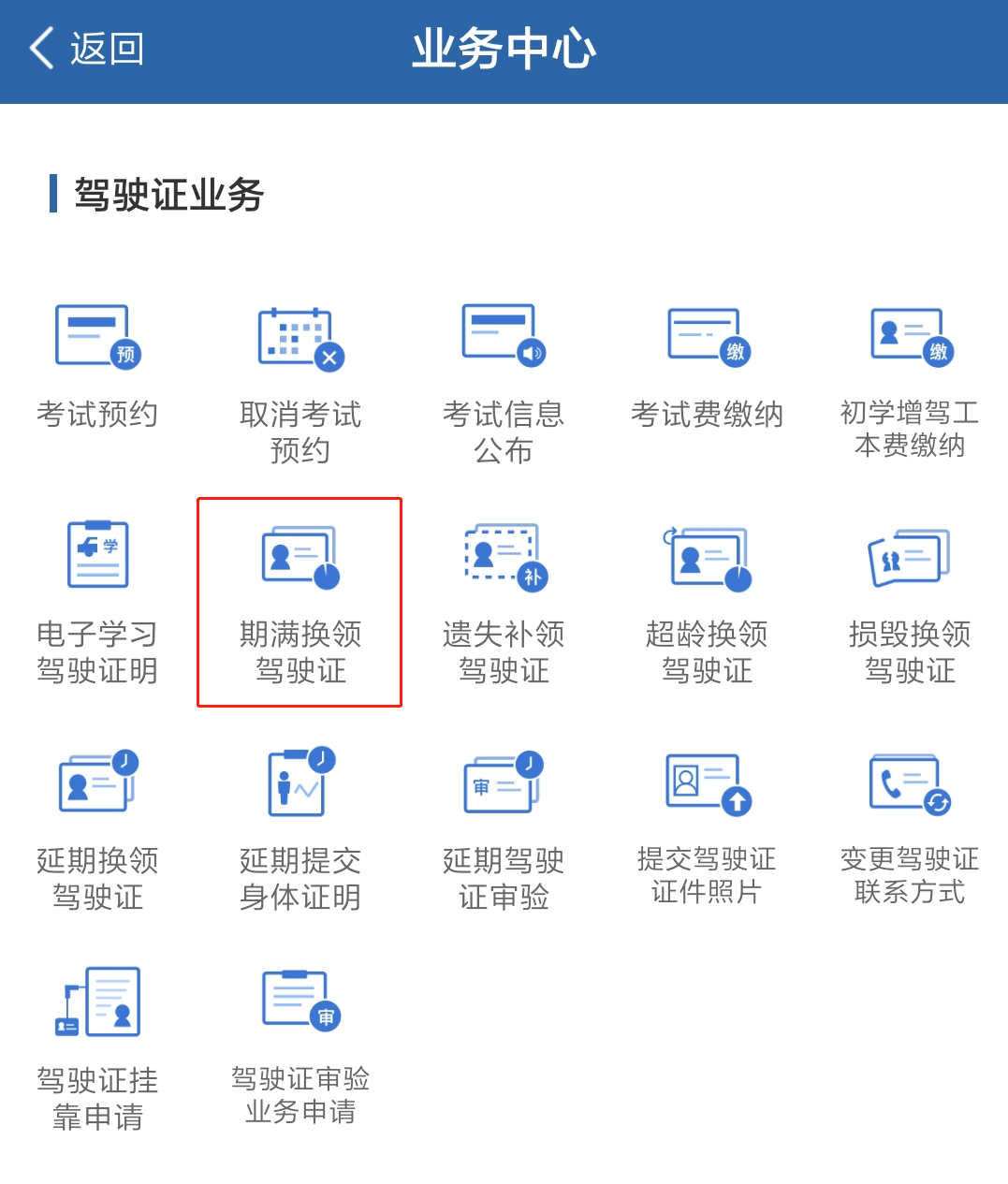下载安装“交管12123”APP,注册登录后,点击“更多”进入【业务中心】栏目,在“驾驶证业务”选择“期满换领驾驶证”。