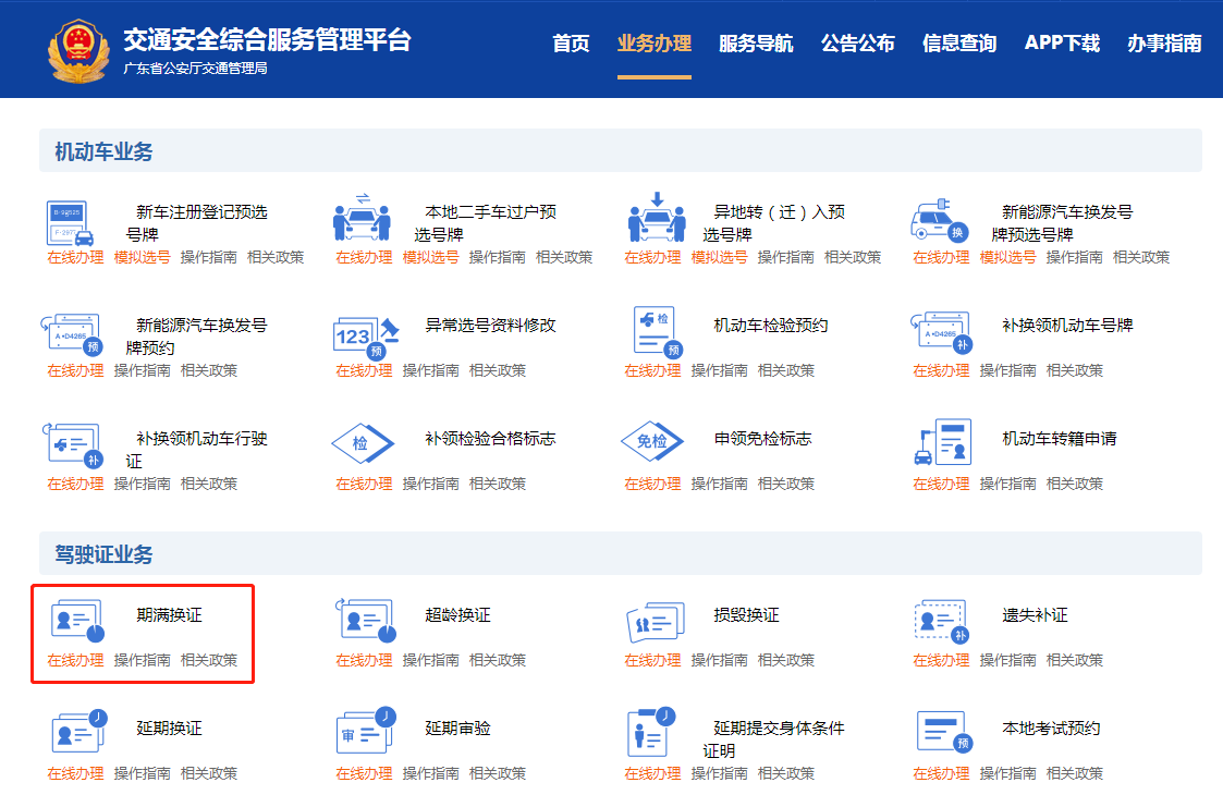 Step2:点击【业务办理】栏目,在“驾驶证业务”选择“期满换证”。