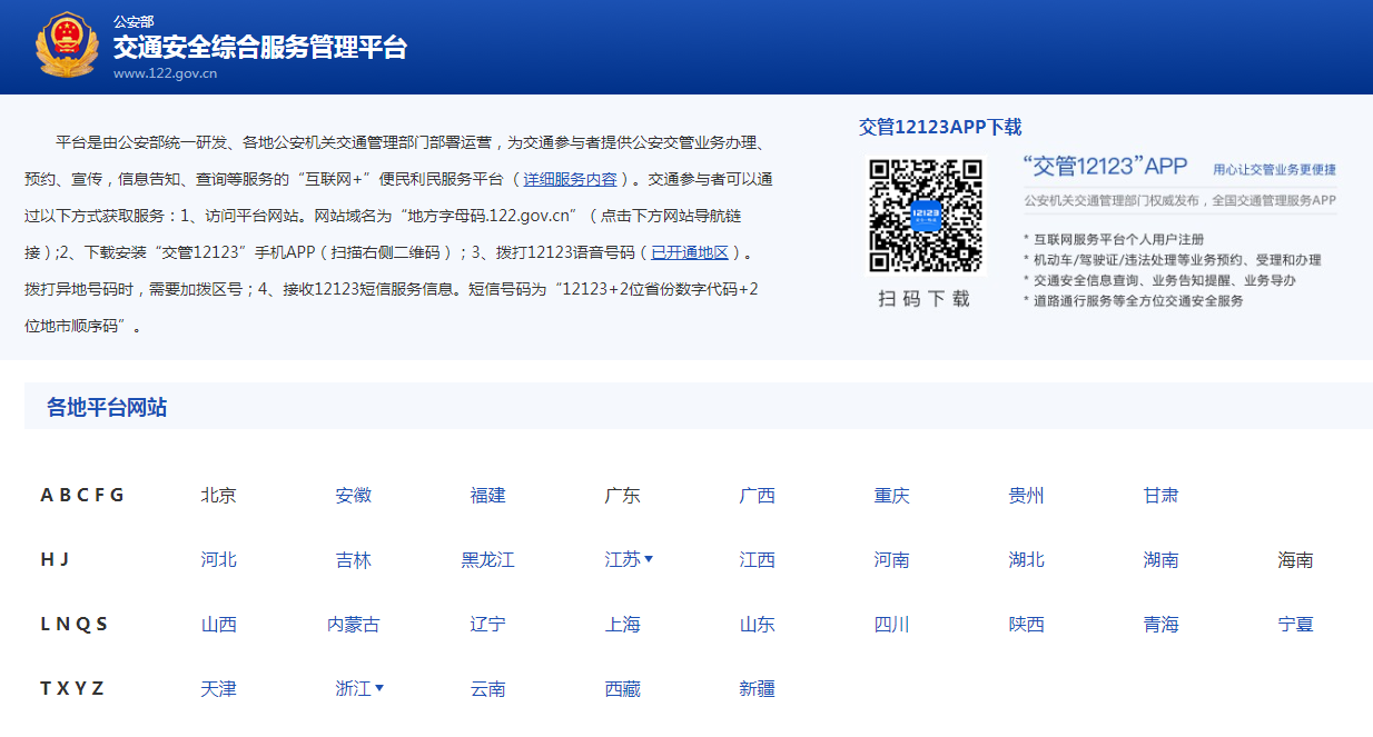Step1:进入平台(www.122.gov.cn),选择所在省份,跳转当地服务平台;