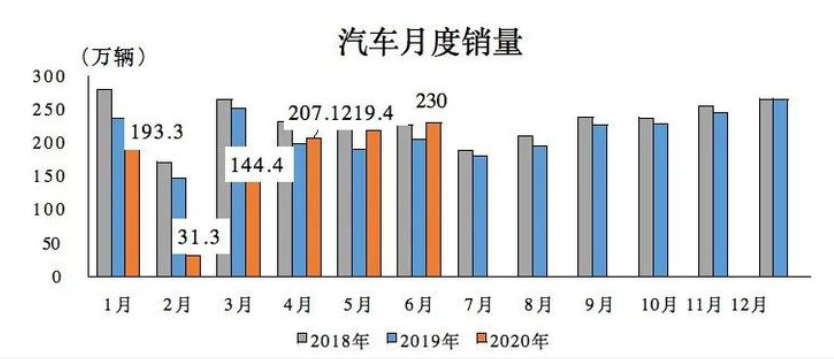今年受疫情影响,1-5月份车市低迷,在国家汽车优惠政策的刺激下,6月汽车销量回暖。中国汽车工业协会最新统计数据显示:6月汽车产销持续回暖,产销分别完成232.5万辆和230.0万辆,环比分别增长6.3%和4.8%,同比分别增长22.5%和11.6%,产销量创同月份历史新高。