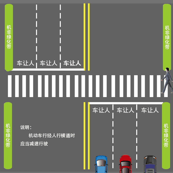 行人步入斑马线,第③车道车辆必须让行,行人开始通过斑马线,所在车道车辆和下一车道车辆必须让行,行人到达中央绿化隔离带或双黄线,下一车道车辆必须让行。