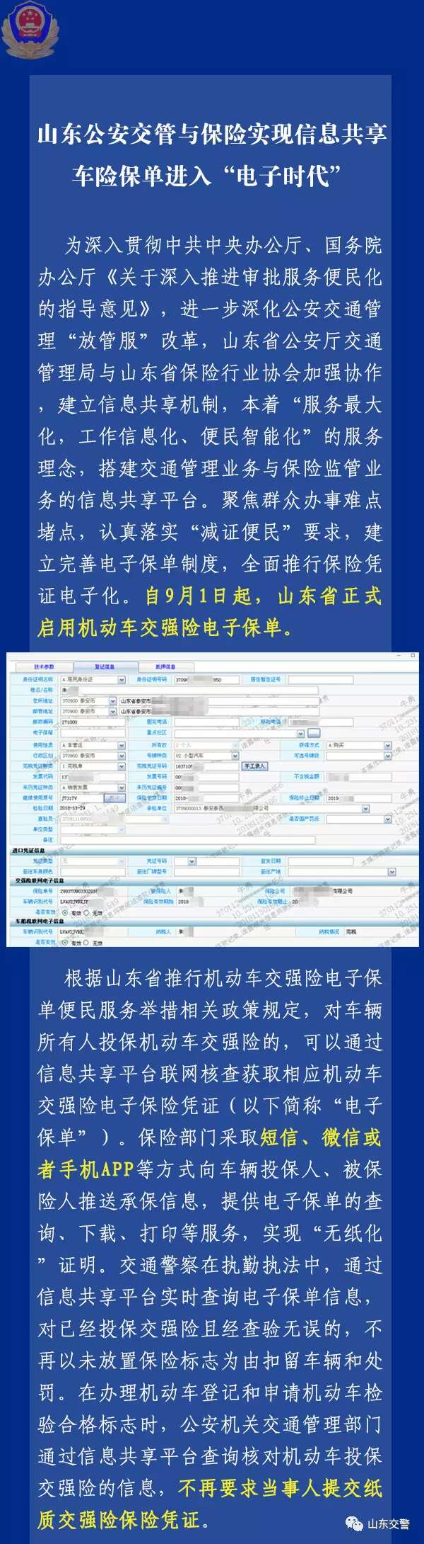 2018年,山东省公安厅交通管理局、山东省保险行业协会联合下发的“鲁公交﹝2018﹞59号”文件要求,自2018年9月1日起交管部门已实现在路面安全检查、交通事故处理、车辆登记年检等环节,实时获取交强险承保信息。