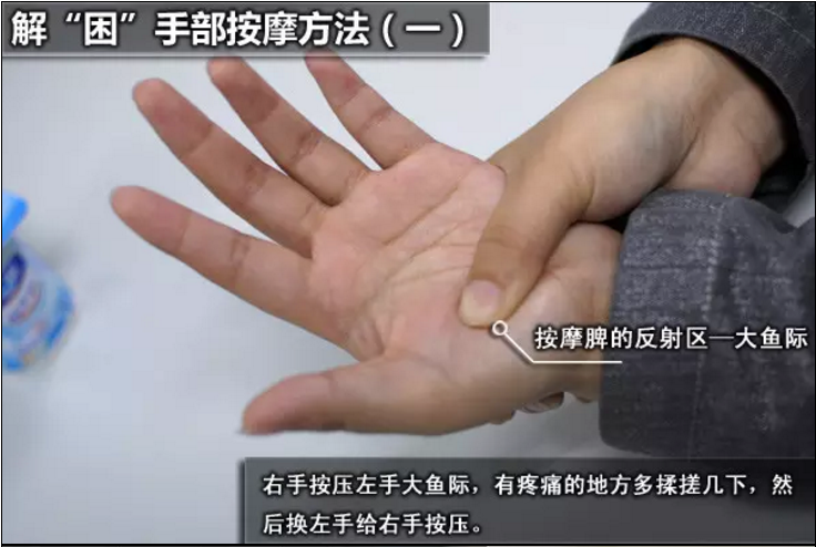 做法:右手大拇指按压左手大拇指骨下掌面隆起的像鸡腿肉的这块区域,称作大鱼际,也是脾的反射区。先按左手,再按右手。按摩的方法很简单,拇指按下去后轻揉每个地方,感觉痛的地方可以多揉。选择这个部位是脾的经脉的穴位,按压感觉到疼就起到活血化淤、促进血液循环的作用,使脾发挥运送营养的功能,改善打瞌睡这一方面的症状。