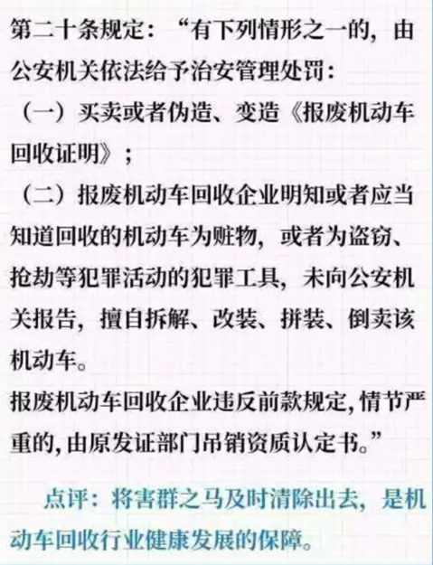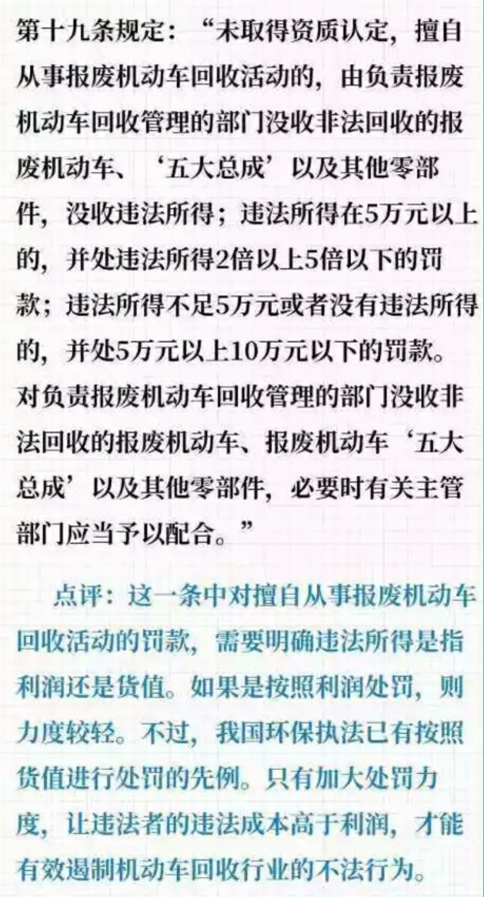 同时,报废机动车新规更加注重环保。新的《报废机动车回收管理办法》规定,拆解报废机动车,应当遵守环境保护法律、法规和强制性标准,采取有效措施保护环境,不得造成环境污染。