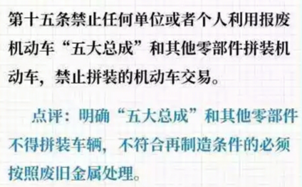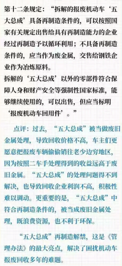 新版《报废机动车回收管理办法》消除了报废机动车零部件再制造的法律障碍,规定拆解的报废机动车发动机、方向机、变速器、前后桥、车架等“五大总成”具备再制造条件的,可以按照国家有关规定出售给具备再制造能力的企业予以循环利用。在旧版《办法》中,“五大总成”只能作为冶炼的原材料进行回炉。也就是说,报废车告别被视为废铁论斤卖的时代!