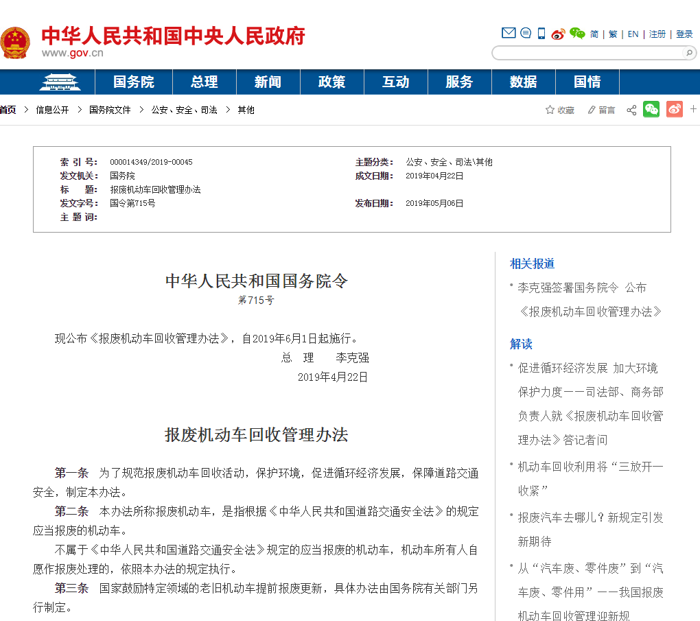 5月6日,国务院正式公布《报废机动车回收管理办法》(以下简称《办法》),并将自2019年6月1日起施行。国务院2001年6月16日公布的《报废汽车回收管理办法》同时废止。