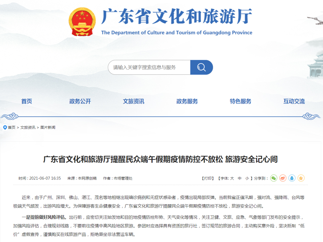 近日,广东省文化和旅游厅发布提醒:建议广东省中高风险区域所在城市的居民暂不外出旅游,减少疫情传播风险。确实需要离开本市外出旅行的,要按照当地疫情防控部门的相关要求,严格落实核酸检测等疫情防控措施。