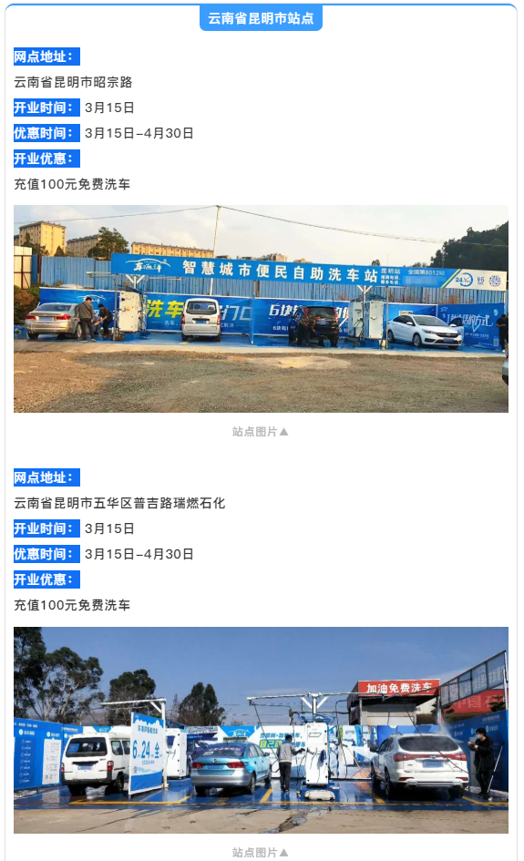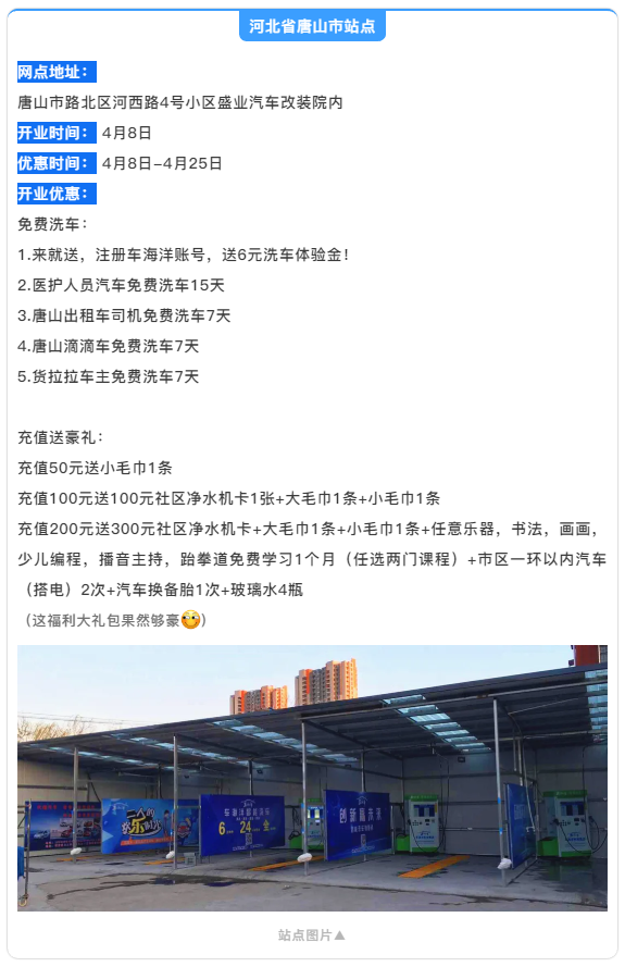 近期,多个城市的车海洋网点齐开业运营,进一步扩大车海洋的布局规模,更好地服务广大车主。开业运营期间优惠多多,首次免费洗车+充值优惠,还有优惠福利礼包大放送!