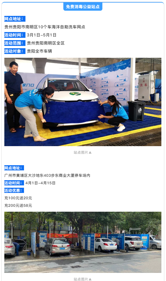 另外,为了支持防疫工作,还有一大波车海洋智能洗车网点给广大车主送福利啦,开展了一波力度大大的“感恩回馈优惠大酬宾”活动。看看有没有你附近的网点