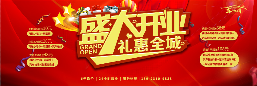 4、充值400赠送68元;送2条小毛巾+2瓶雨刮精+2瓶汽车柏油+2瓶泡沫清洁剂