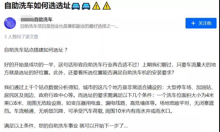 如今,自助洗车项目因是低风险创业的典型代表,受到越来越多创业者的关注。人们习惯在网上搜索一些文章,然后自己研究一通;不少小品牌商家借机在网上投放大量推广软文,但由于自身专业度不够,容易对读者造成误导,最终导致读者创业失败。