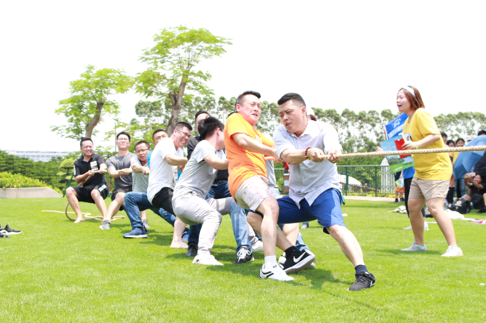 只见男神们咬紧牙、抓紧绳、喊口号、挥汗如雨,旁边观战的女同事既紧张又激动,大声为男神们加油鼓劲。比赛进行得热火朝天,胜利的一方有大奖奖励,这激起了大家的胜负心,哪怕手磨破皮、哪怕浑身汗湿、哪怕晒脱皮,也要为团队摘得桂冠,赢得荣誉,男同事的卖力拼搏,把旁边当啦啦队助阵的女同事感动了。