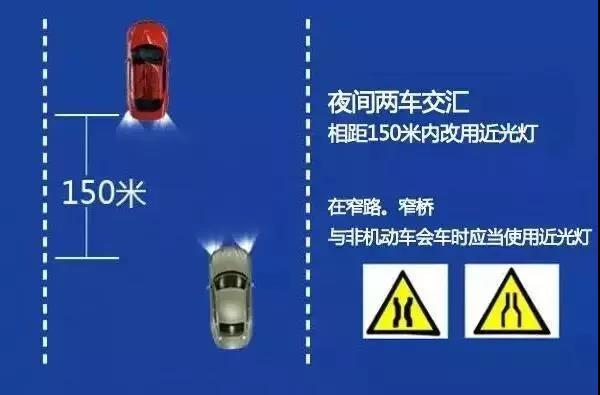 ▲夜间会车,使用远光、近光相结合,如果前方有车或者对面有来车,应当在距相对方向来车 150 米以外改用近光灯;