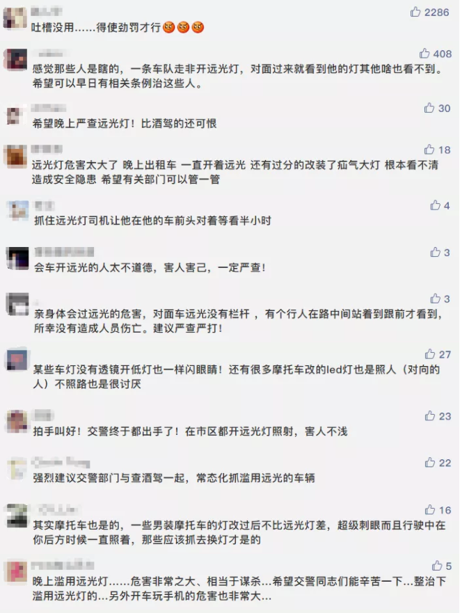 对于这些处罚,很多车主都拍手称好,认为交警蜀黍做得对,这种漠视他人安全、违反交规的行为就该重罚。所以,各位车主夜间开车要按规定使用远光灯哦~